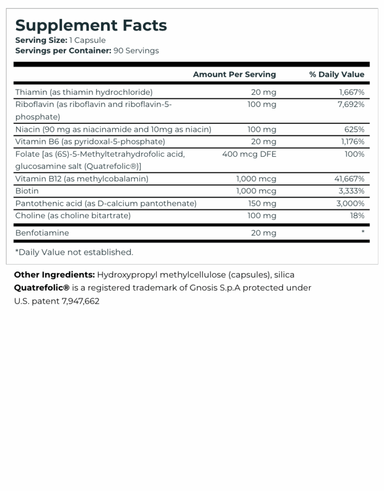 A brilliantly balanced B Complex created with forms that maximize bioavailability, along with choline, to support detoxification, mood, cognition, methylation, energy and hair/skin/nail health.*